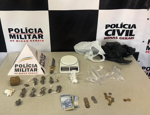 tablete de maconha, oito envólucros com cocaína, uma balança de precisão, material para embalagem da droga, uma faca e certa quantia em dinheiro.