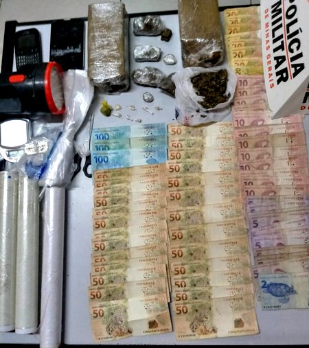 Durante buscas na residência, foram localizadas sete pedras de crack embaladas e prontas para o comércio; três buchas de maconha e mais uma porção da mesma substância; a quantia de R$ 1.952,00; três rolos de plástico filme comumente utilizados para embalagem de drogas; vários sacolés comumente utilizados para embalagem de drogas; uma lâmina de barbear possivelmente utilizada para fracionar drogas; uma mochila e uma lanterna.