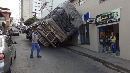 Um caminhão que transporta uma grande, e principalmente, alta carga de carvão ao passar pela Padre Lobo nesta tarde de terça-feira 18/06 tombou parcialmente, ficando escorado na parede de uma loja e em um poste de iluminação pública. Ninguém ficou ferido.