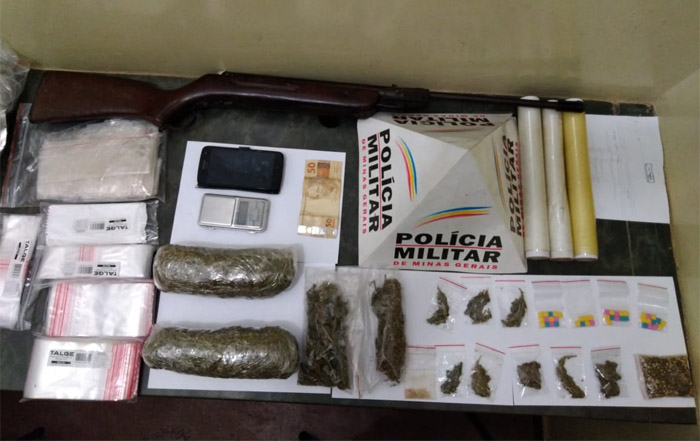 Foram localizados ainda 04 (quatro) invólucros, contendo 43 (quarenta e três) comprimidos de Ecstasy, R$50,00 (cinquenta) reais em espécie, 01 (uma) balança de precisão, materiais para acondicionar drogas, 01 (uma) espingarda de pressão, bem como um aparelho celular.