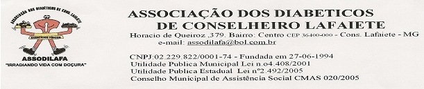 Convocamos os associados para Assembleia Ordinária de Eleição e Posse da Diretoria e Conselho Fiscal da Associação dos Diabéticos de Conselheiro Lafaiete – ASSODILAFA, a realizar-se no dia 11/09/2019, às 18:00 horas, em primeira convocação e meia hora depois em segunda convocação, na à Rua Carijós, n° 340, Bairro Fonte Grande, em Conselheiro Lafaiete-MG.