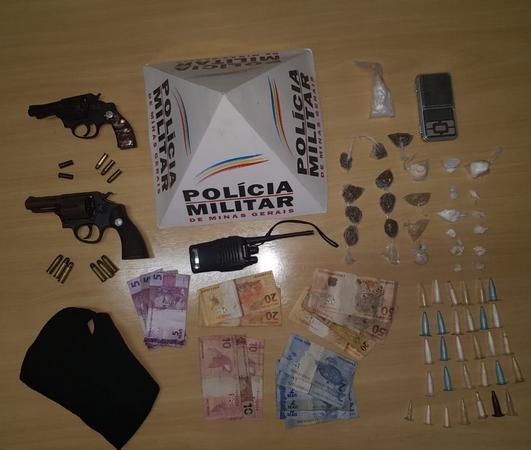 Durante as buscas no imóvel, foram localizados 26 (vinte e seis) pinos grandes de cocaína, 02 (dois) pinos pequenos de cocaína, 14 (quatorze) papelotes de cocaína, 09 (nove) buchas de maconha, 01 (uma) balança de precisão, 01 (uma) touca ninja, R$ 237 (duzentos e trinta e sete) reais, 01 (um) rádio comunicador, 03 (três) buchas de crack, 01 (um) revólver calibre 38, 01 (um) revólver calibre 32, 03 (três) munições cal. 32 deflagradas e 03 (três) picotadas, 06 (seis) munições calibre 38 intactas e 03 (três) buchas maiores de cocaína.