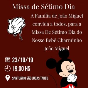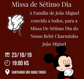 A família de João Miguel agradece as manifestações de pesar recebidas pelo seu falecimento e convida para a missa de 7º dia que será celebrada por sua alma, nesta quarta-feira, às 19h, no Santuário de São Judas Tadeu, em Conselheiro Lafaiete.