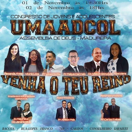 O Congresso de Jovens e Adolescentes acontecerá no Espaço Baccus, situado a rua Lopes Franco, 760 no bairro Carijós em frente a Faculdade e Hotel Minas Platinum. Na sexta-feira haverá uma vigília a partir das 19h30  e no sábado a partir das 18:30 horas. Nesta edição, teremos como tema “VENHA O TEU REINO”, onde todos buscam mais de Deus e o verdadeiro e genuíno avivamento que incendeia o íntimo dos nossos corações e nos leva a viver uma vida pessoal de arrependimento e gratidão a Deus com reflexos intensos e duradouros.