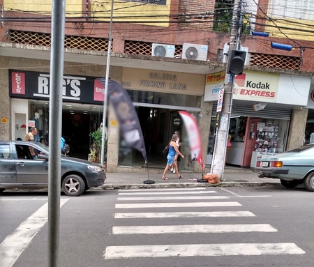 Como se não bastasse ocupar o espaço público, esse comércio teve a ousadia de colocar um obstáculo a faixa de pedestres.