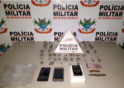 Identificados (21 e 29 anos) e submetidos à busca pessoal houve o encontro de 42 buchas de maconha, dois aparelhos celulares, uma máquina de cartão, vários sacolés usados para embalar drogas e a quantia de R$ 15,00 (quinze reais), configurando o crime de tráfico de drogas. Eles foram presos em flagrante delito e conduzidos para a delegacia de Polícia em Conselheiro Lafaiete.