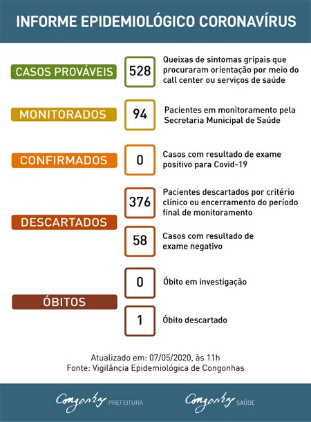 O coronavírus já está circulando em Congonhas e em municípios próximos. Ainda não foi registrado caso positivo para a Covid-19 na cidade, segundo Informe Epidemiológico divulgado nesta quinta-feira 07/05 mas essa estatística pode mudar.