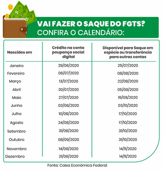 A realização de saques e transferências para outras contas seguirá outro calendário. Para os nascidos em janeiro, essas operações estarão disponíveis a partir de 25 de julho. Por outro lado, quem faz aniversário em novembro e dezembro terá acesso a essas transações em 14 de novembro.