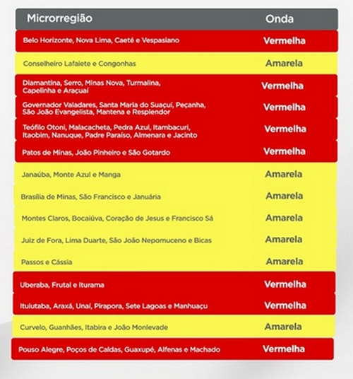 Nenhuma macrorregião mineira apresentou, até o momento, índices favoráveis para a inclusão na onda verde, que permite a abertura de academias, clubes, cinemas e estúdios de piercings e tatuagens, entre outros serviços. Para avançar para a onda verde, as cidades precisam estar há 28 dias consecutivos na onda amarela, sem sofrer retrocessos durante esse período.