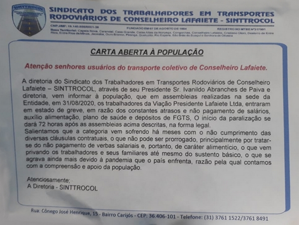 A deliberação foi anunciada, ao término do segundo encontro, pelo presidente do SINTTROCOL (Sindicato dos Trabalhadores em Transporte Rodoviário de Conselheiro Lafaiete), Ivanildo Abranches de Paiva. “O sindicato está preparando toda a documentação para comunicar à Prefeitura, à Polícia Militar e à própria empresa que a categoria vai paralisar as atividades. O serviço essencial vai ser mantido, mas ainda será negociado com a empresa quantos ônibus vão permanecer rodando. O que a gente não pode prever é por quanto tempo o Município e a população vão suportar ir ao trabalho ou atender aos compromissos diários com a frota reduzida”, disse em entrevista ao Fato Real.