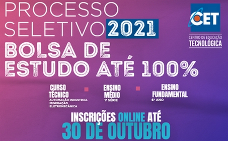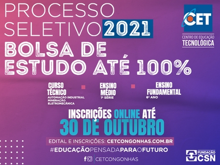 Além do Conheça o CET, a escola também abriu as inscrições para o processo seletivo de bolsas de estudo de até 100% para o CET. A escola da Fundação CSN oferece bolsas nas turmas do 6º ano do Ensino Fundamental, 1ª série do Ensino Médio e para os cursos técnicos de Automação Industrial, Eletromecânica e Mineração e os candidatos podem se inscrever até o dia 30 de outubro de 2020. Para mais informações, basta acessar o site do CET: https://cetcongonhas.com.br/