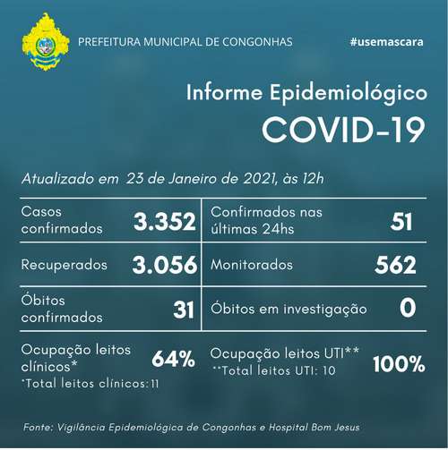 A Secretaria Municipal de Saúde informa que, até às 12h deste sábado, 23 de janeiro de 2021 o total de 3.352 casos de Covid-19 haviam sido confirmados em Congonhas.