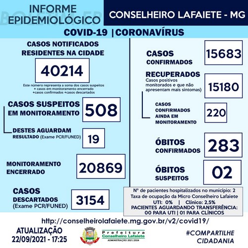 A ocupação dos leitos em Lafaiete nesta quarta 22/09, está em 0% em leitos de UTI e 2,5% em clínicos.