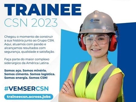 O Grupo CSN (Companhia Siderúrgica Nacional) abriu vagas para trainees em suas unidades. Entre os pré-requisitos estão formação de dezembro de 2019 a dezembro de 2022 em qualquer curso, sem restrição. O inglês, embora não obrigatório, será um diferencial. Maior complexo siderúrgico da América Latina e uma das maiores multinacionais brasileiras, a CSN possui cerca de 30 mil colaboradores.