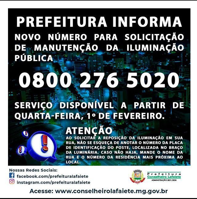 A partir desta quarta-feira, 1º de fevereiro, uma nova empresa assume o serviço de manutenção da iluminação pública em Conselheiro Lafaiete: a Luz Forte.