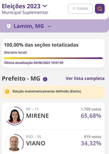 Mirene Silva (PP) segue no comando da prefeitura de Lamim. Ela, que era presidente da Câmara Municipal ,e vem exercendo o cargo desde 1º de janeiro deste ano devido a impugnação do candidato com maior número de votos nas eleições de 2020, teve a maioria dos votos em eleição suplementar que ocorreu neste domingo 04/06/2023.