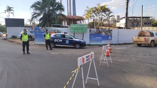 Agentes de trânsito estão nesta tarde na rua Valério Eugênio, nas imediações do canteiro de obras da construção do viaduto da MRS que vai ligar os bairros Cachoeira e Areal.