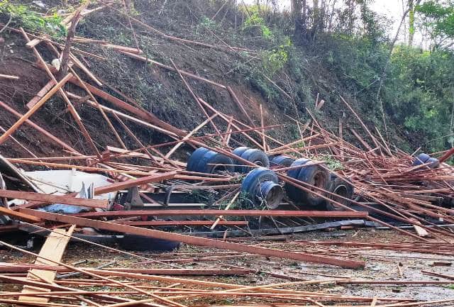 Um caminhão capotou no local e a carga de madeira ficou parcialmente  espalhada na pista, causando sua interdição. A pista está interditada apenas um lado e o local está  sinalizado, aguardando a retirada do material da pista.