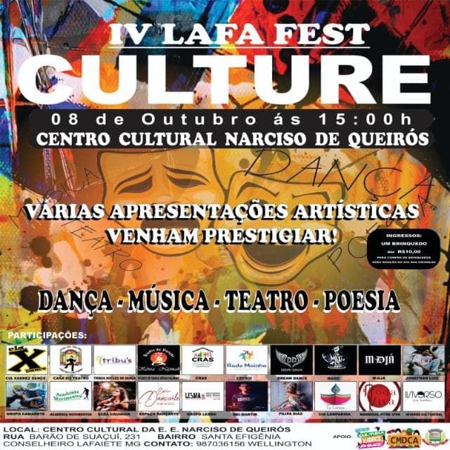 O Ponto de Cultura Cia Xadrez Dance convida a toda população para prestigiar o IV LAFA FEST CULTURE , que será realizado nese domingo dia 8 de outubro, a partir de 15 horas, no Centro Cultural Narciso de Queirós.