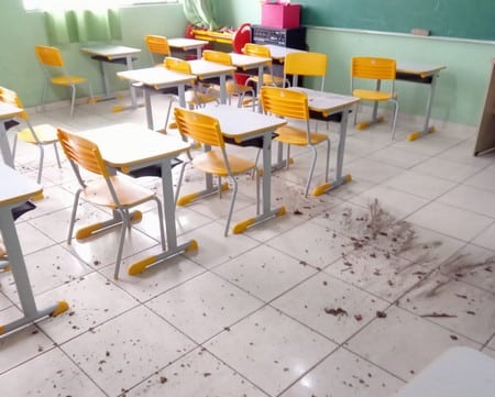 Nesta segunda-feira (16) quando chegaram para as aulas, os alunos encontraram o teto parcialmente desabado e muitas fezes de pombo espalhadas em carteiras e no chão. O problema se repete na quadra e outros pontos da escola.