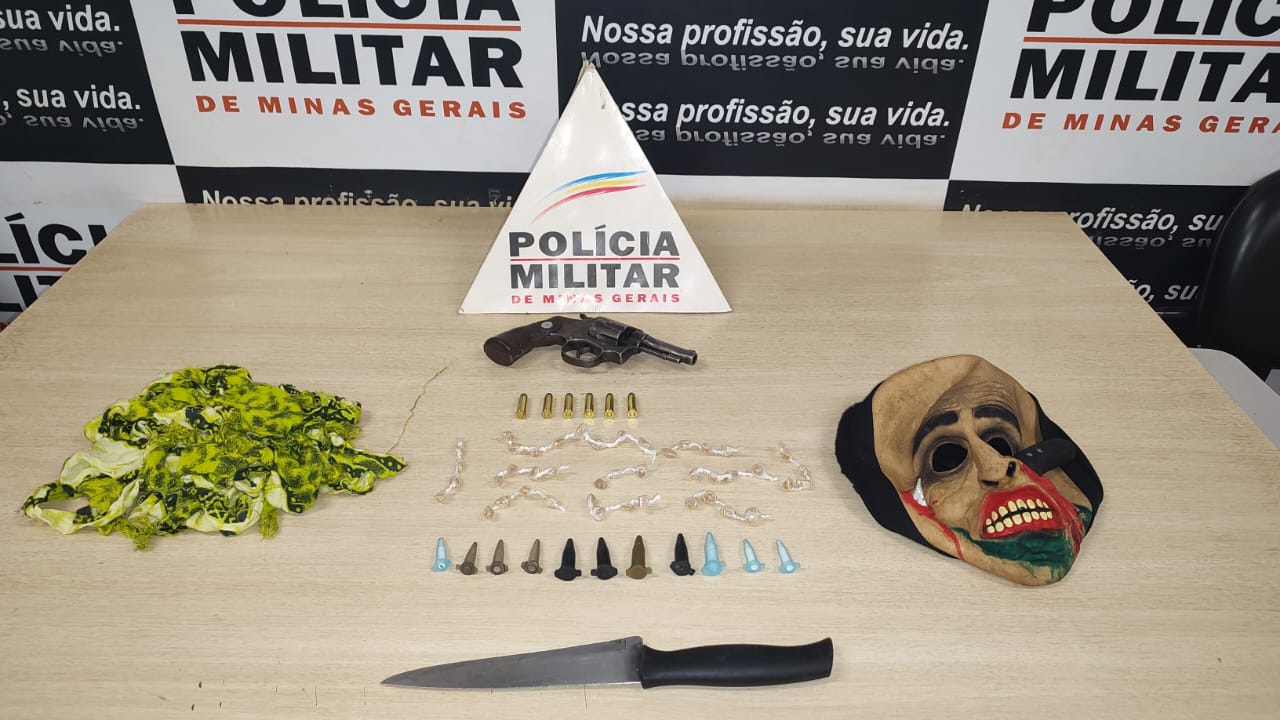 Os suspeitos foram submetidos à busca pessoal, sendo localizado um revolver calibre .32 com seis munições, uma máscara de borracha e uma sacola plástica com várias tiras de pano, aparentando que seriam usadas como corda para amarrar pessoas e uma faca. Ainda foram encontradas 42 pedras de crack embaladas para venda e 11 micro tubos (pinos) de cocaína, que tentaram descartar quando os policiais se aproximaram.