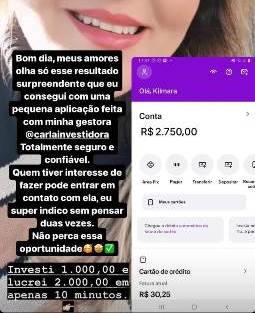 Usando os contatos de Kilmara, golpistas passaram a enviar ofertas de aplicação financeira com altos retornos. Para convencer as vítimas, afirmam que Kilmara Tavares teria recebido o dobro do investido. Inclusive, com foto da locutora falso extrato financeiro “comprovando” o rendimento.