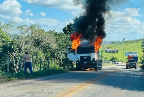 Caminhão em chamas trava trânsito na MG-129