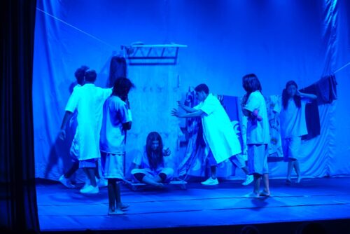 A dança urbana conduzia a narrativa com precisão e dor. Os movimentos eram secos, repetitivos, quase mecânicos. Como se o corpo tivesse desaprendido a ser livre. A iluminação recortava a cena. O azul das vestimentas contrastava com a luz precisa. Tudo pensado. Tudo sentido. Cada movimento era calculado e, ainda assim, pulsava dor real. A plateia prendeu o fôlego. Não dava para piscar. Não dava para desviar. A sensação era de invasão e, ao mesmo tempo, de pertencimento. Aquela história também era nossa. Não estava distante no tempo. Nem tão longe assim.