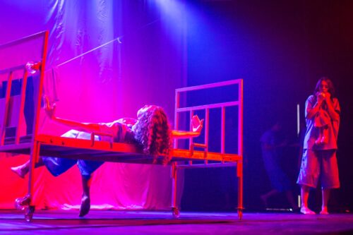 Na plateia, não havia distância segura. Os personagens se escondiam, eram perseguidos. Fugiam. Se misturavam ao público entre as cadeiras. Eram caçados por figuras que representavam médicos, enfermeiros, psiquiatras. A cena simulava contenções, choques, punições. Tudo muito próximo. Tudo muito real. Ninguém piscava. Ninguém desviava o olhar. A encenação dissolvia o limite entre palco e plateia. Ninguém assistia de fora.