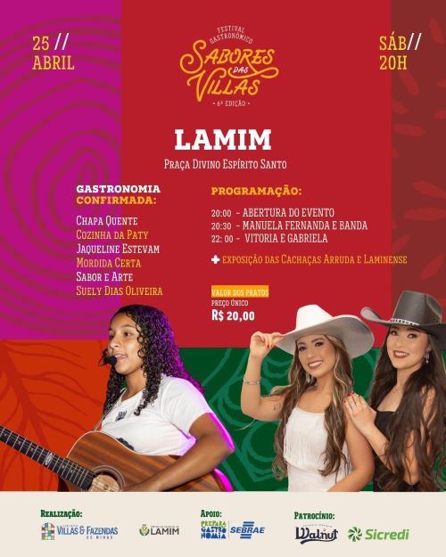 No sábado (25), a programação acontece em Lamim, na Praça Divino Espírito Santo, a partir das 20h. O público poderá experimentar pratos preparados especialmente para o festival ao valor único de R$ 20. A noite terá apresentações musicais com Manuela Fernanda e Banda e com a dupla Vitória e Gabriela. Também haverá exposição das cachaças Arruda e Laminense, ampliando a valorização dos produtos locais.