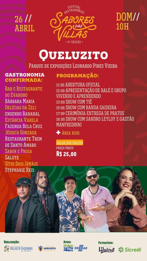 No domingo (26), o festival segue para Queluzito, no Parque de Exposições Leonardo Pires Vieira, a partir das 11h. Os pratos serão vendidos por R$ 25. A programação inclui apresentação de balé, shows musicais com artistas regionais e área kids dedicada ao público infantil. A proposta é oferecer um ambiente familiar, com atividades culturais e gastronômicas ao longo do dia.